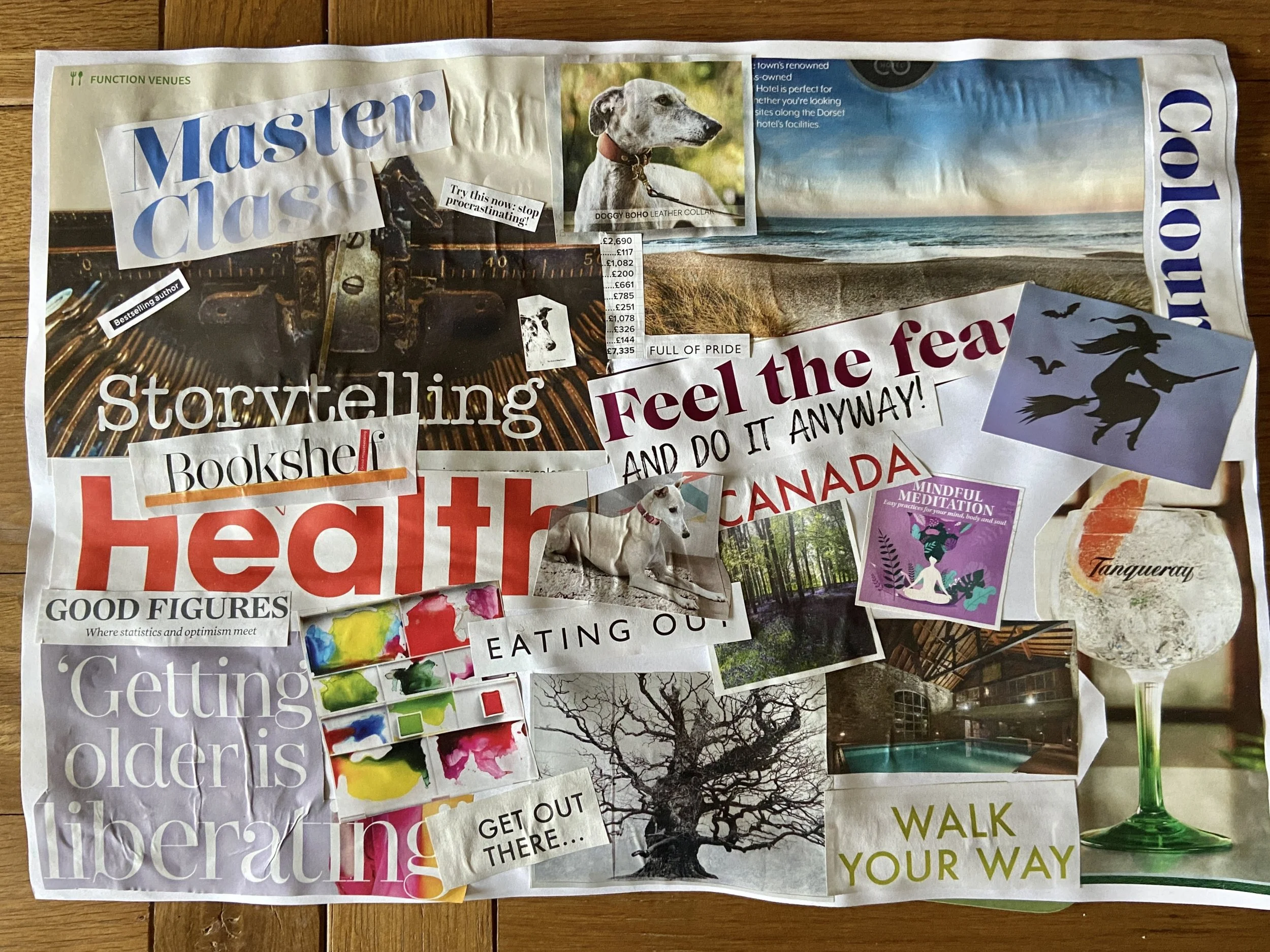 So there I was, literally cutting and pasting. Words and phrases such as ‘getting older is liberating’, ‘feel the fear and do it anyway’, ‘storytelling’ and ‘whippet’ found their way onto my board in a wave of optimism and future manifesting. All the while, the conversations and witticisms of my fellow cut and pasters provided the soundtrack (the horse who thinks he’s a ‘fucking rhino’ and the descriptions of the two ‘Shitland’ Ponies; along with the phrase ‘oh yeah, chickens are bastards’; and the tale of rat brought in by one lady’s cat in the middle of the night, resulting in her carrying the then bag-wrapped rat, by the light of the silvery moon on the winter solstice, in her pyjamas to release it.)